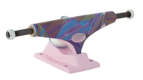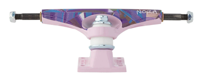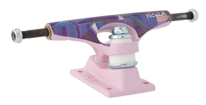 Krux Nora Vasconcellos Triangle K5 trucks featuring abstract artwork by Nora. New and improved K5 Krux Truck with the "purr-fect turn." Quicker turning geometry, a new pivot cup shape, re-designed hanger and sexy-ass baseplate combined with the strongest axles available make the K5 the best Krux Truck ever made.